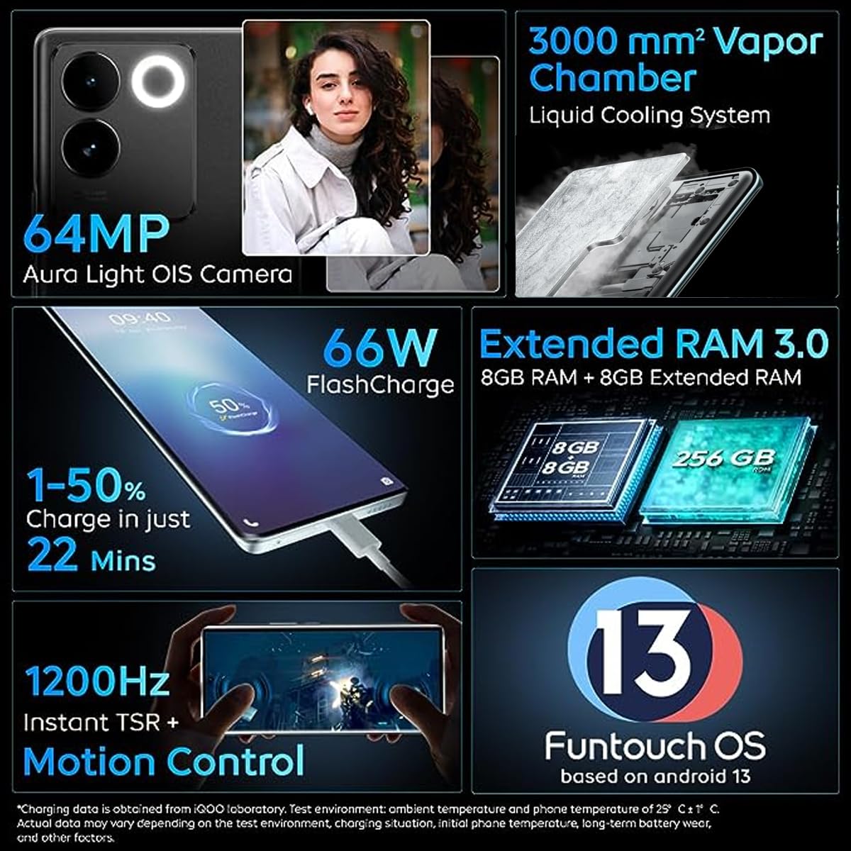 Brand iQOO Operating System Funtouch OS 13 Based On Android 13 RAM Memory Installed Size 8 GB CPU Model Snapdragon CPU Speed 2.8 GHz